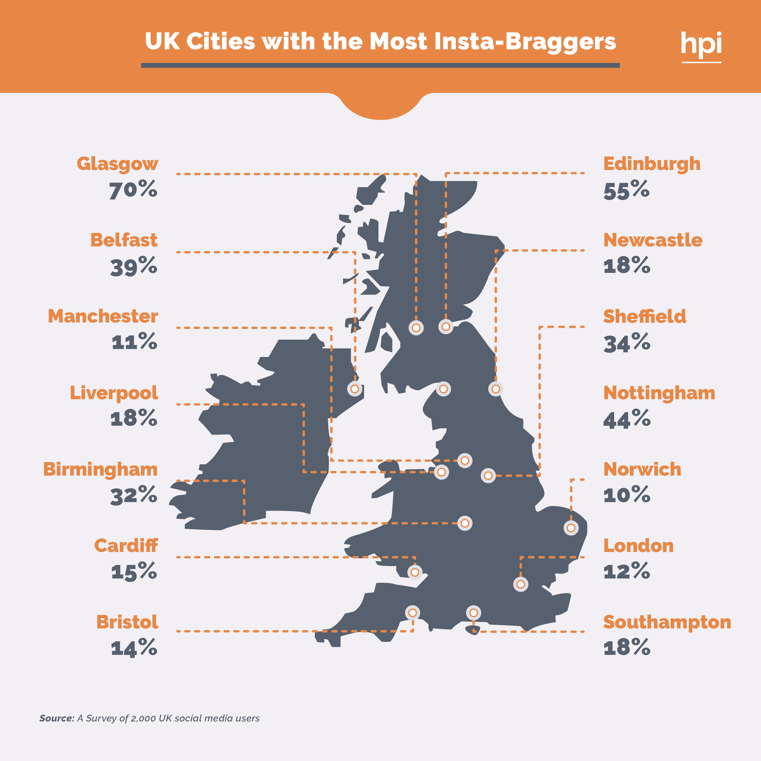 With 95% admitting to boasting about their cars online and 70% stating they Insta-brag at least once per day, Glasgow is the biggest bragging city in the UK. On the other hand, Norwich is home to those least likely to show off, with just 10% of respondents saying they brag on Instagram.